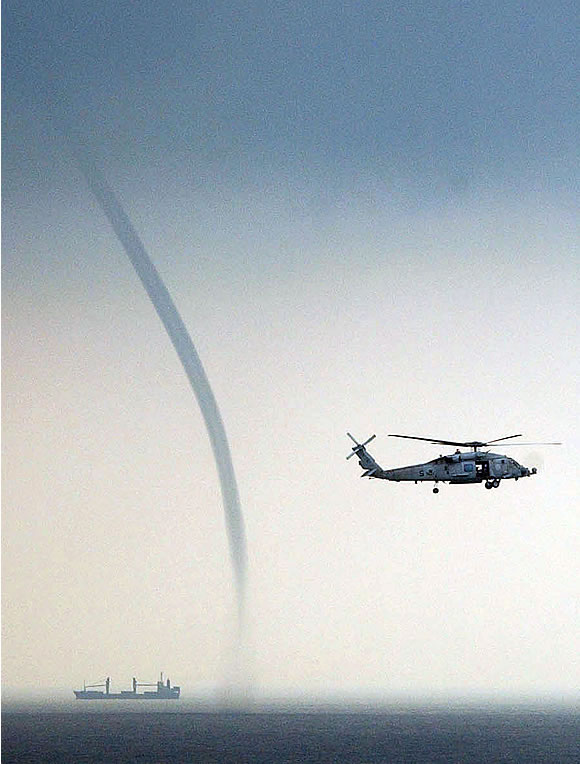 An HH-60H Seahawk, from Helicopter Anti-Submarine Squadron Four (HS-4), keeps an eye on a nearby vessel and a waterspout in the South China Sea, off the coast of Malaysia, Sept. 5, 2004.