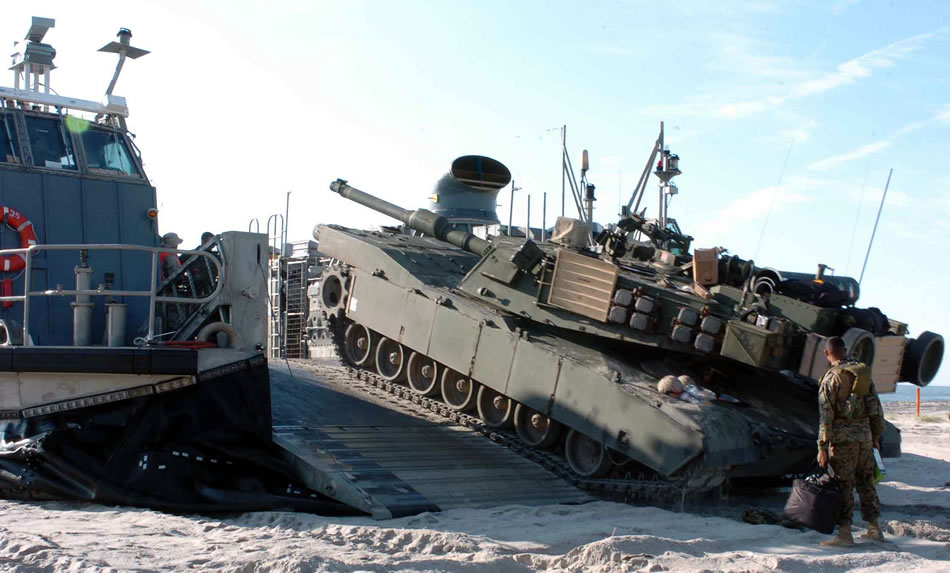 Morehead City, N.C. (Nov. 5, 2005) � Marines assigned to the 22nd Marine Expeditionary Unit (22nd MEU) load an M1A1 Abrams tank onto a U.S. Navy Landing Craft, Air Cushion (LCAC) for transport to the dock landing ship USS Carter Hall (LSD 50). Carter Hall is part of Expeditionary Strike Group Eight (ESG-8), which left Naval Amphibious Base Little Creek, Va., to on load the 22nd MEU before departing on a regularly scheduled deployment in support of the Global War on Terror. U.S. Navy photo by Photographer's Mate 3rd Class Laura A. Moore